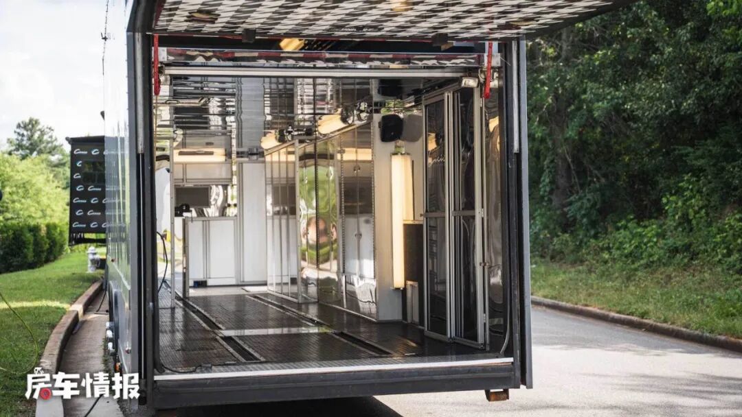 全车外观以灰色为主,装有遮阳棚和水电接口,前车还装有爬梯,可以爬到车辆顶部。整体看上去既有质感又很强悍,户外出行一定是道靓丽的风景线。