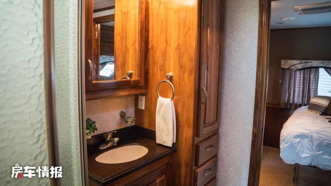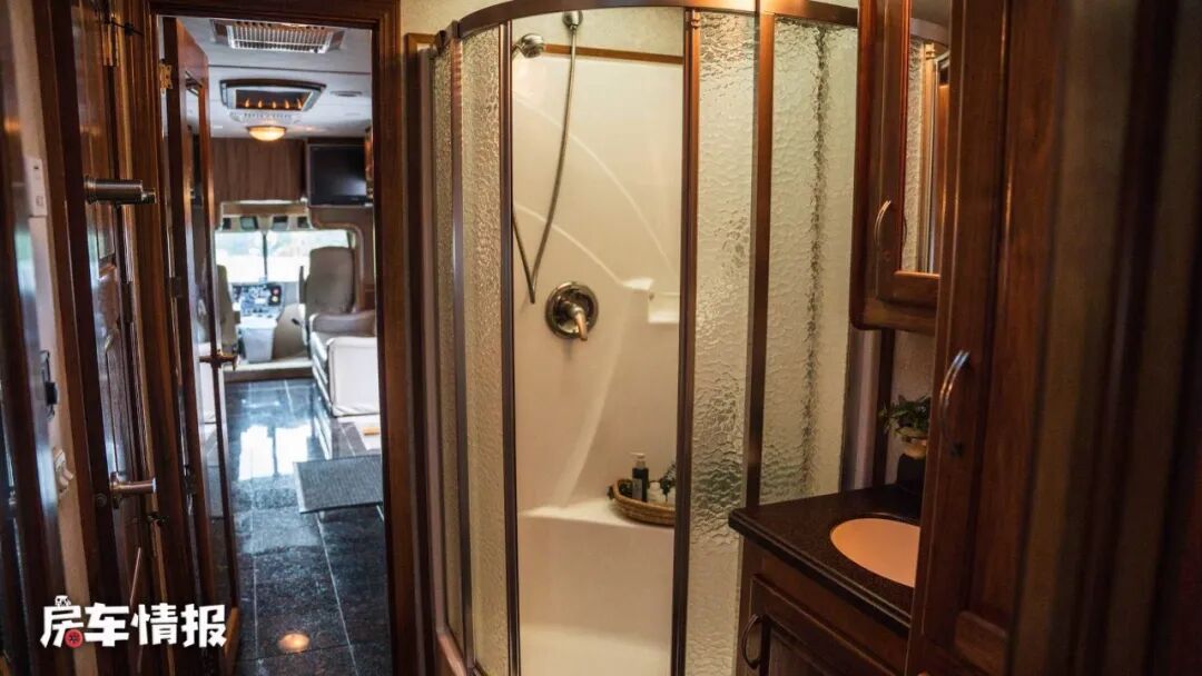 淋浴室的玻璃采用冰裂纹处理,内部还有和家里一样大的空间,不输任何房车浴室。