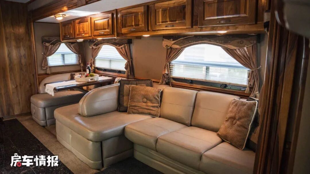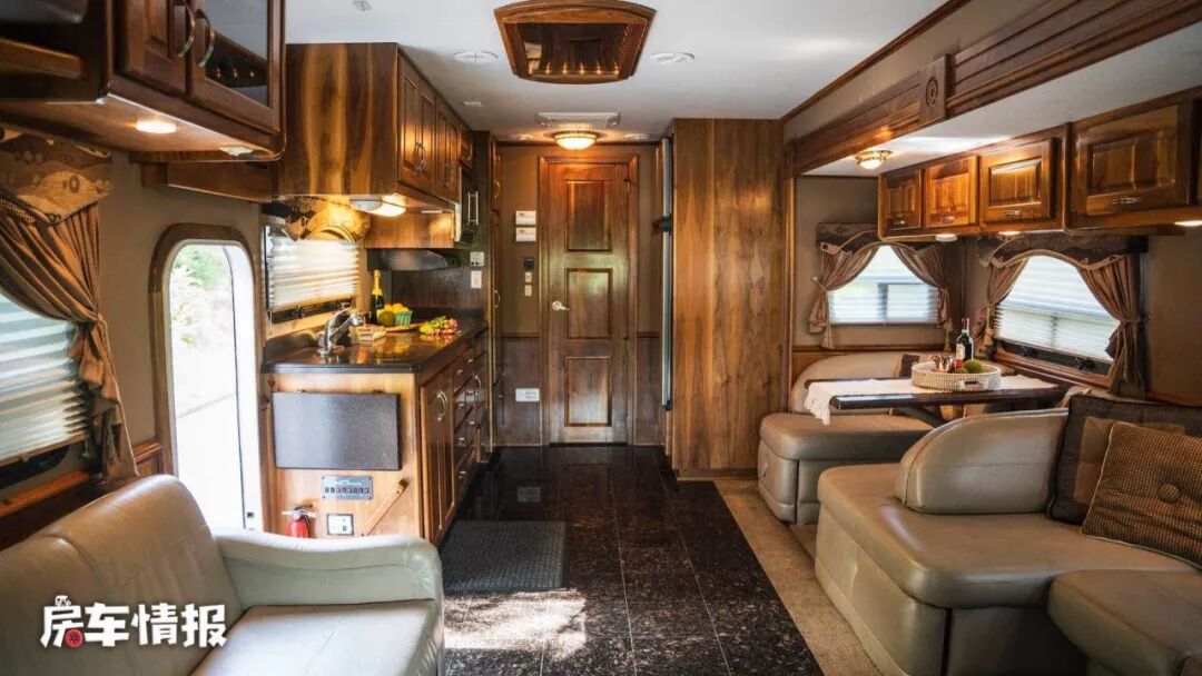 走进生活区,喜欢复古风格的朋友一定会被它深深地吸引住,木纹面板、深色的格调,复古感拉满。往里走,会发现车内超大的空间,两个会客区,设备齐全、完整台面的厨房、双开门的冰箱,干湿分离的卫生间,单独的超大卧室,可见其豪华程度。