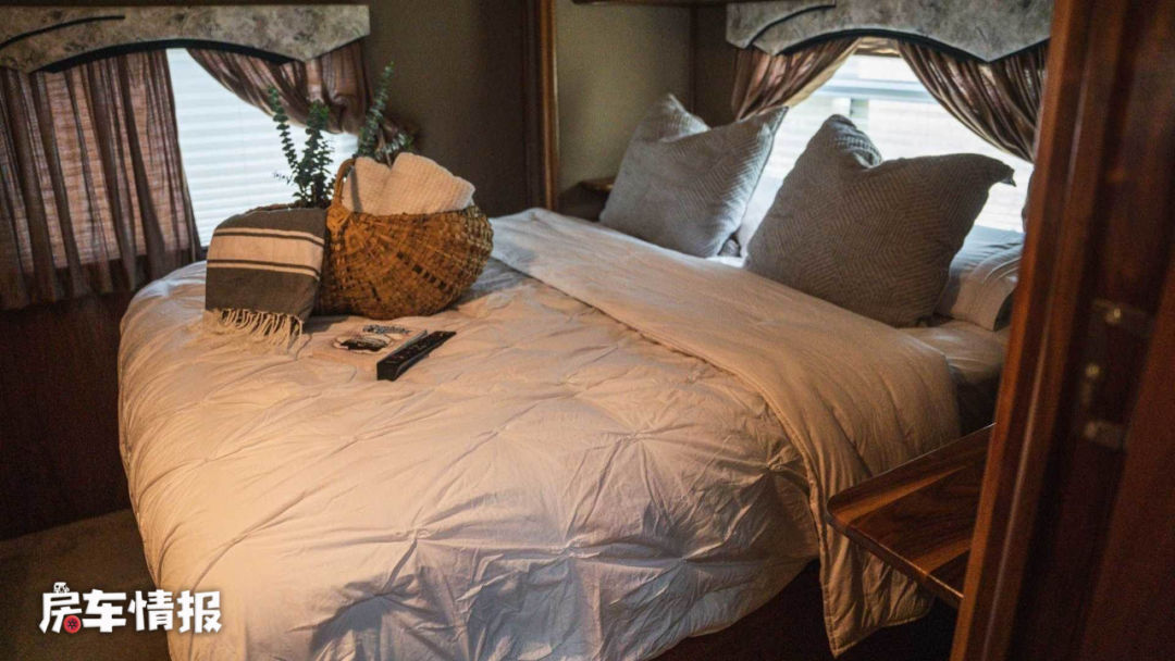 生活区尾部是一个单独的卧室,有一张家里的双人床,旁边还有衣柜,窗帘,俨然就是家里的卧室。