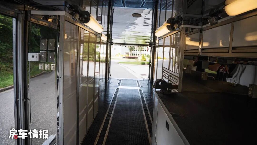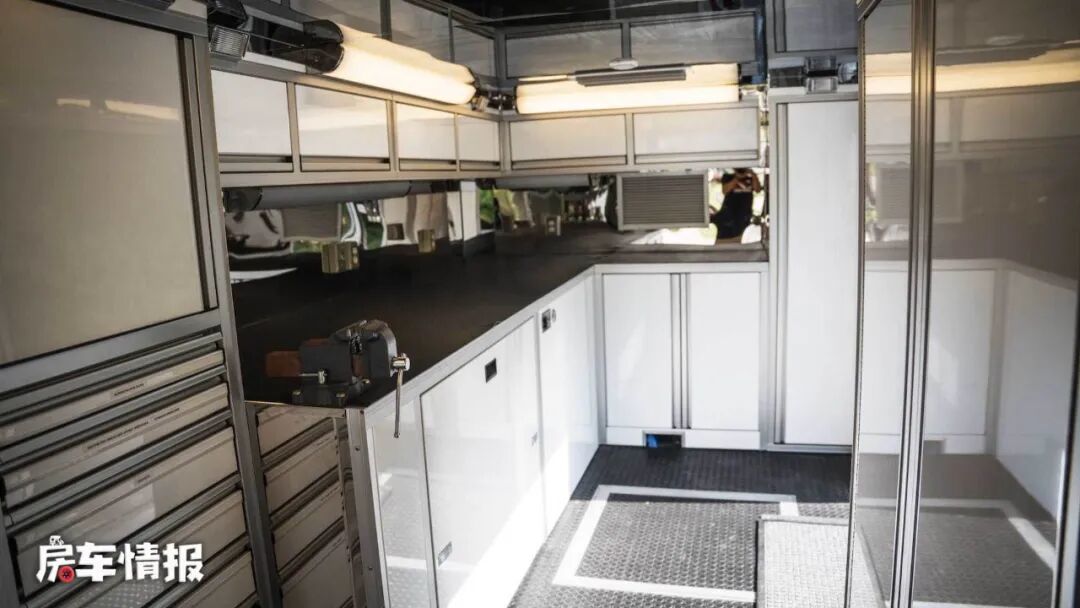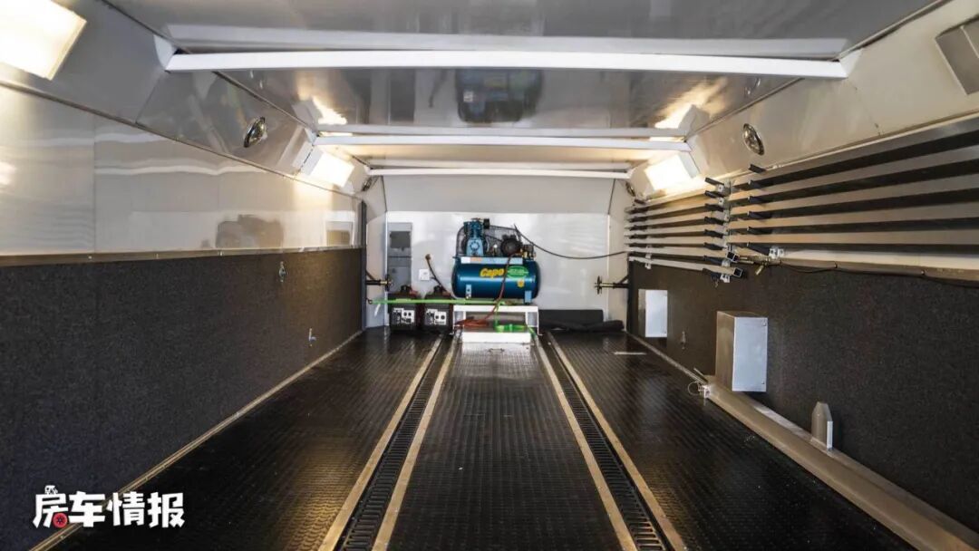 接下来就是本车10米长的拖车部分,这里有着两层车库可以容纳两辆汽车,还配有发电机、空气压缩机、升降机和操作台,让您的户外生活有了更多的游玩和娱乐方式。
