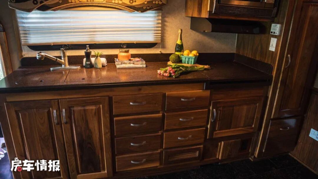 厨房有一个超大的操作台,装有掀盖式的洗菜池、水龙头、油烟机、微波炉,不过在这个奢华的环境里,有些不忍在里面炒菜,油烟污染了车内的环境,会很难清洗。