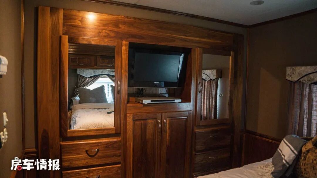 墙上还有一台小电视和DVD播放机,柜面上还有镜子,生活仪式感十足。