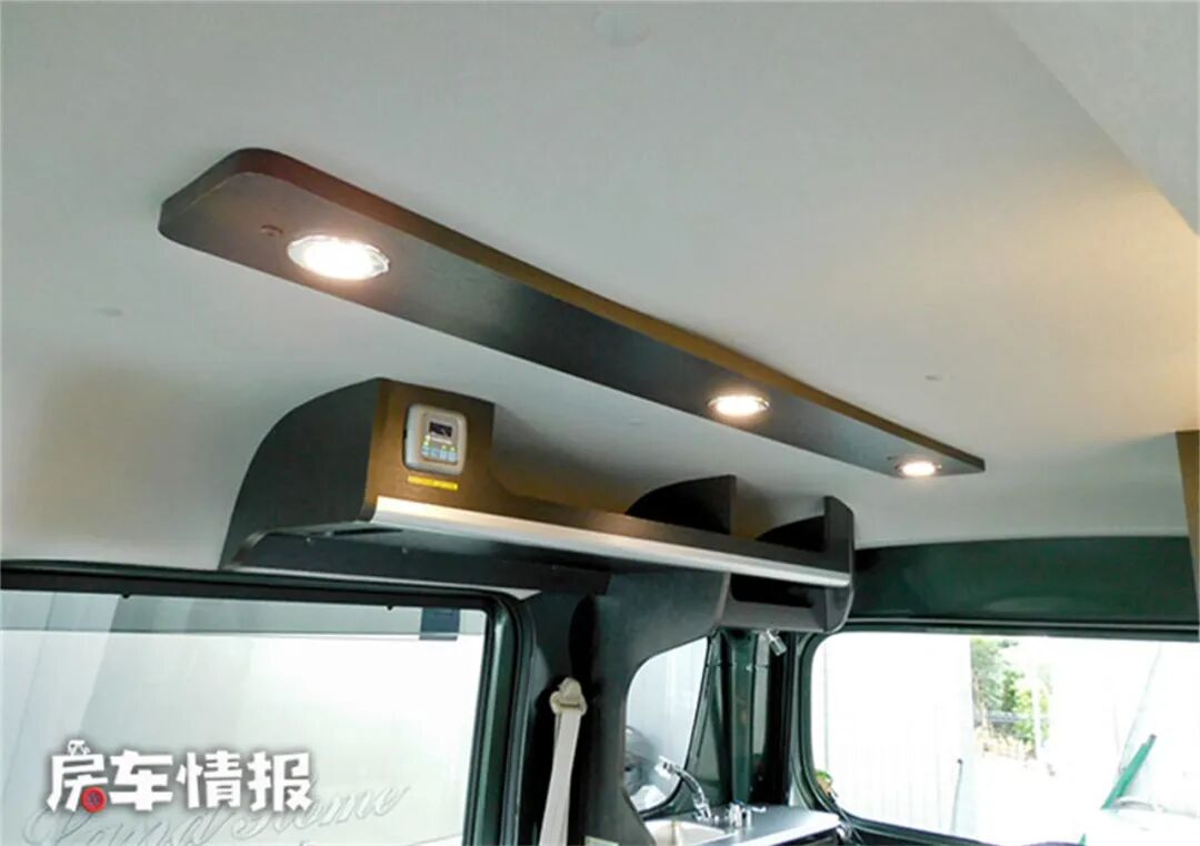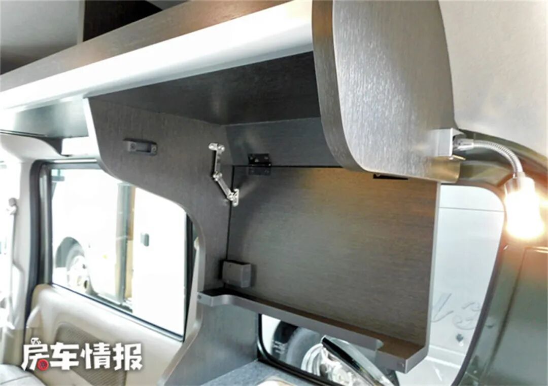 车顶部分左右两侧还装有储物吊柜,可以存放出行的小件行李,