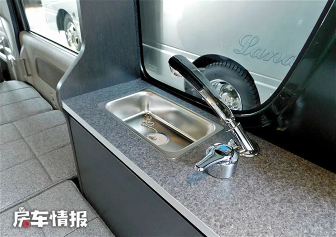 再向后看,便是本车的厨房区域,右侧装有不锈钢洗菜池和水龙头,左侧还有两个凹槽,可以放置小的物品。为了拓宽厨房的操作台面积,两侧还各有一个小桌板可以折叠,这样就可以切菜或者放个卡炉在上面炒菜了。