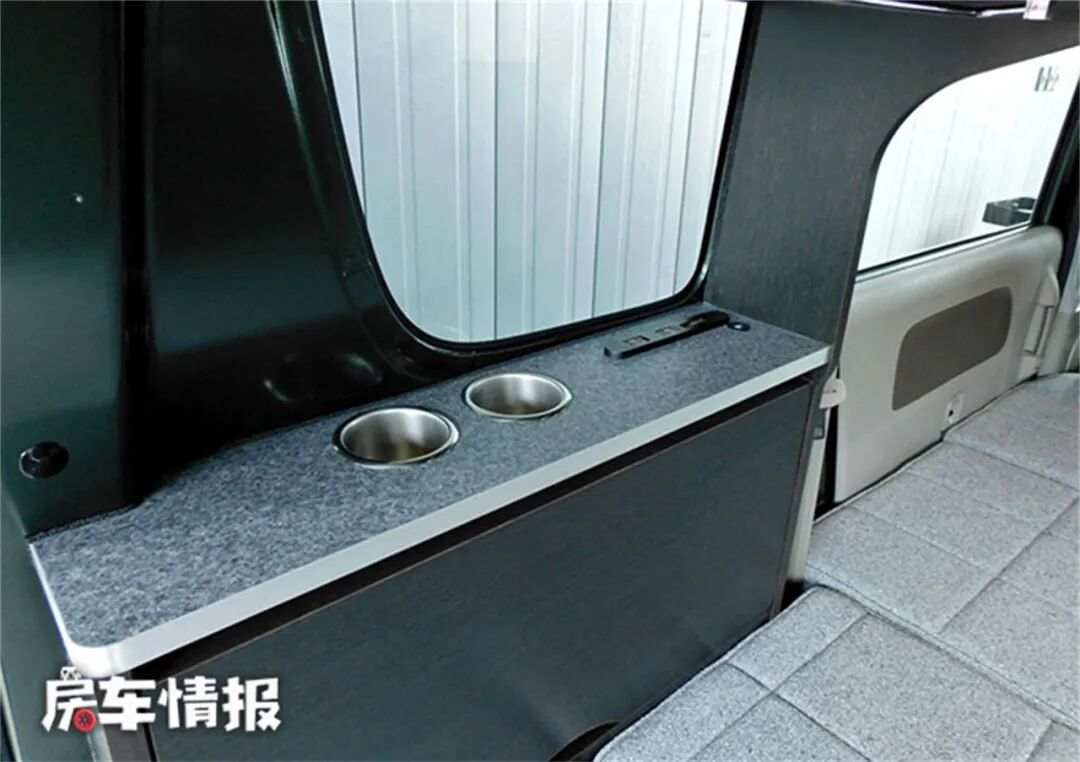 会客区在车辆的后半部分,并不是后排座的位置,而是要把后排座椅靠背放倒,这样两个单独的小桌子就显露出来了,每个桌子上还各有一个水杯凹槽,防止水杯掉落。再搭配后面的双人沙发,这样就形成了一个会客区。