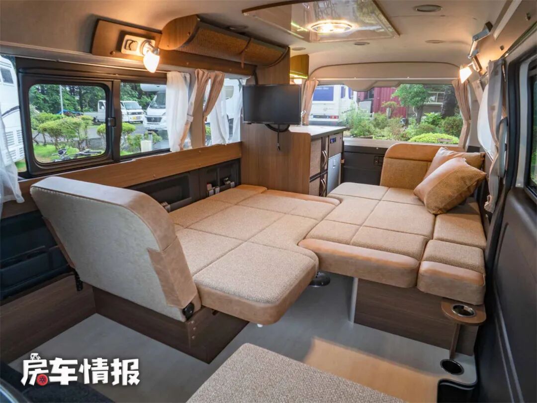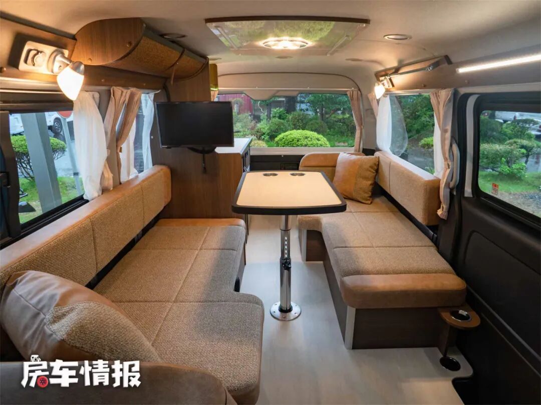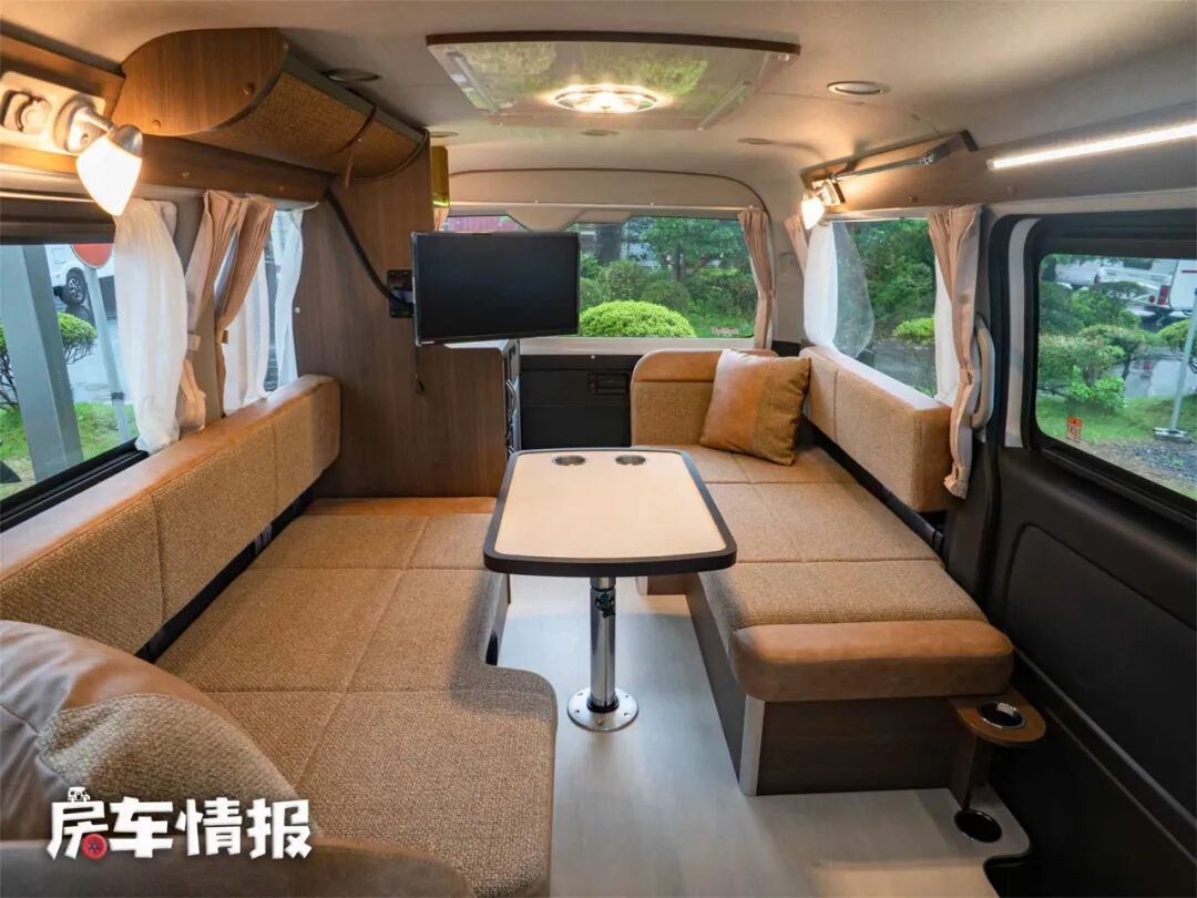 会客区由一张可升降餐桌、中门处的小座椅和两个长沙发组成,两个沙发占据了车两侧大部分的空间,这样就提供了更多的乘坐位置,坐下7、8个人也不是问题。车内窗帘有褶皱和蕾丝两种材质,可以根据不同的使用需求进行切换。顶部还装有照明灯具和储物吊柜,方便大家的生活。右侧沙发尾部还可以选装一台电视机,可以为户外生活增添更多的乐趣。