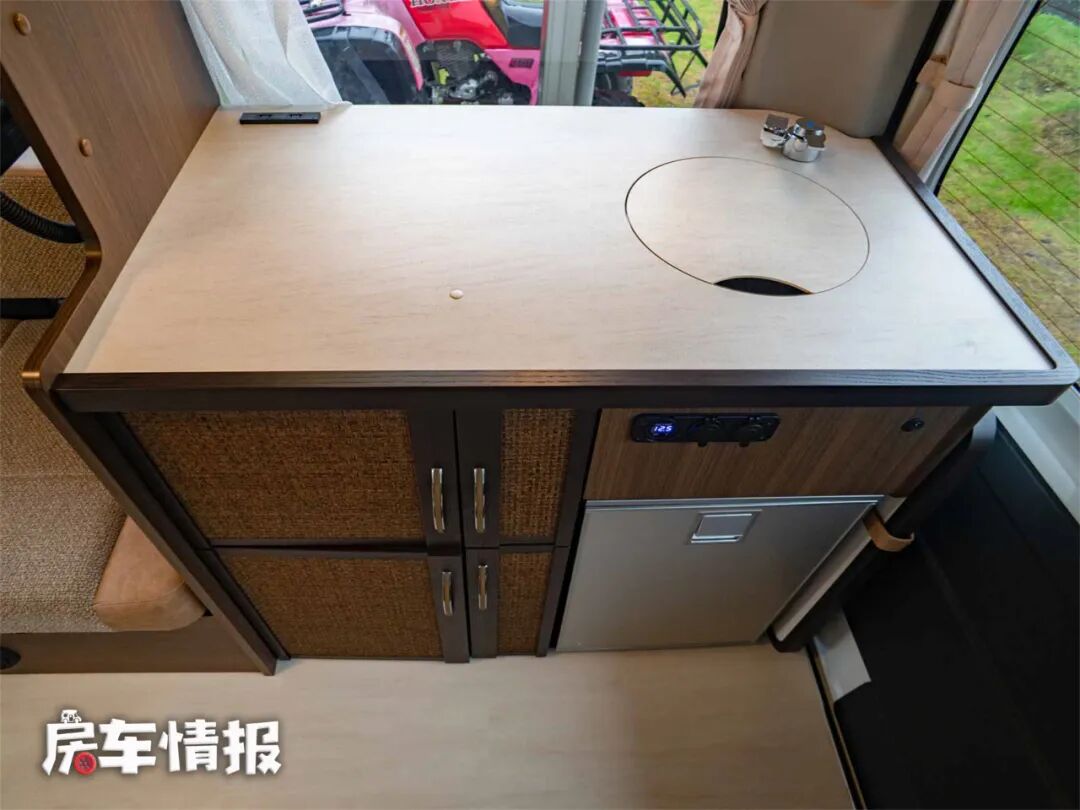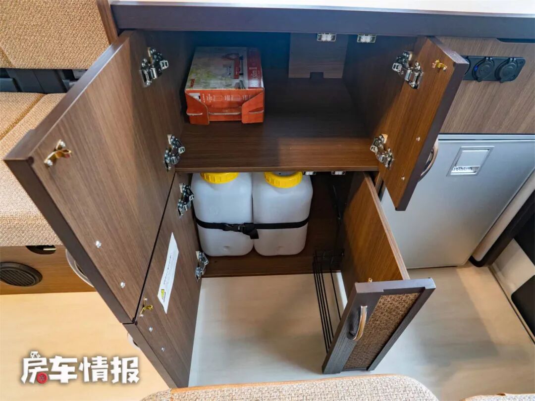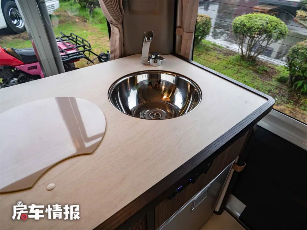 厨房在车尾右侧,有一个足够两人操作的橱柜空间,左侧是平整的操作台、可以放置案板或卡炉,右侧是带有盖子的不锈钢洗菜池和水龙头,下方还有双层储物柜,其中一层已经放置了水箱,另一层还可以放置厨房用具。