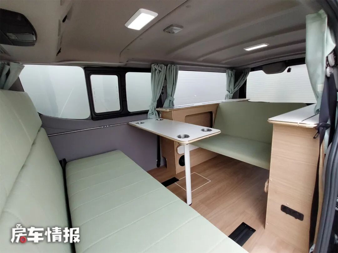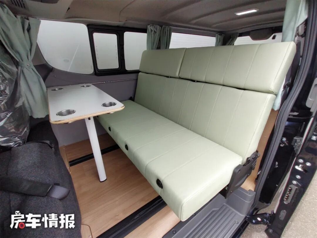 在车门处,有一个双人座椅,地面上装有导轨,可以根据需求移动座椅,右侧墙上还有安装餐桌的位置,餐桌上有4个水杯凹槽,防止水杯掉落。