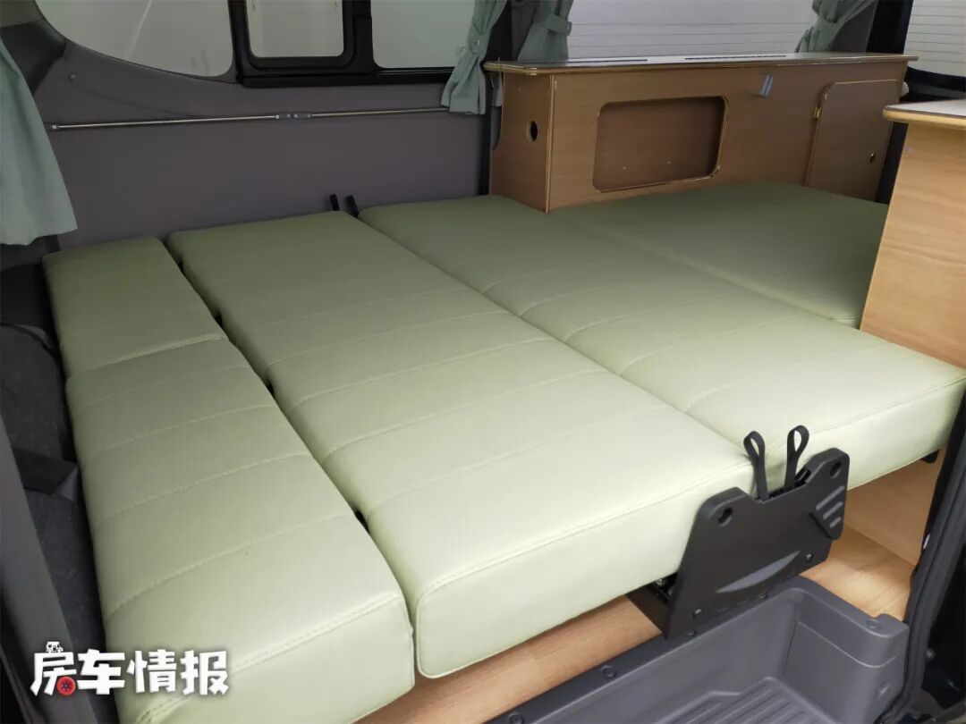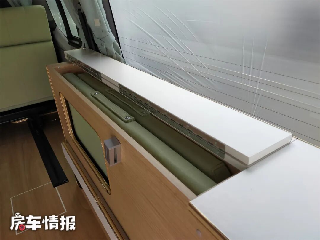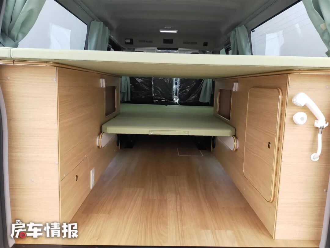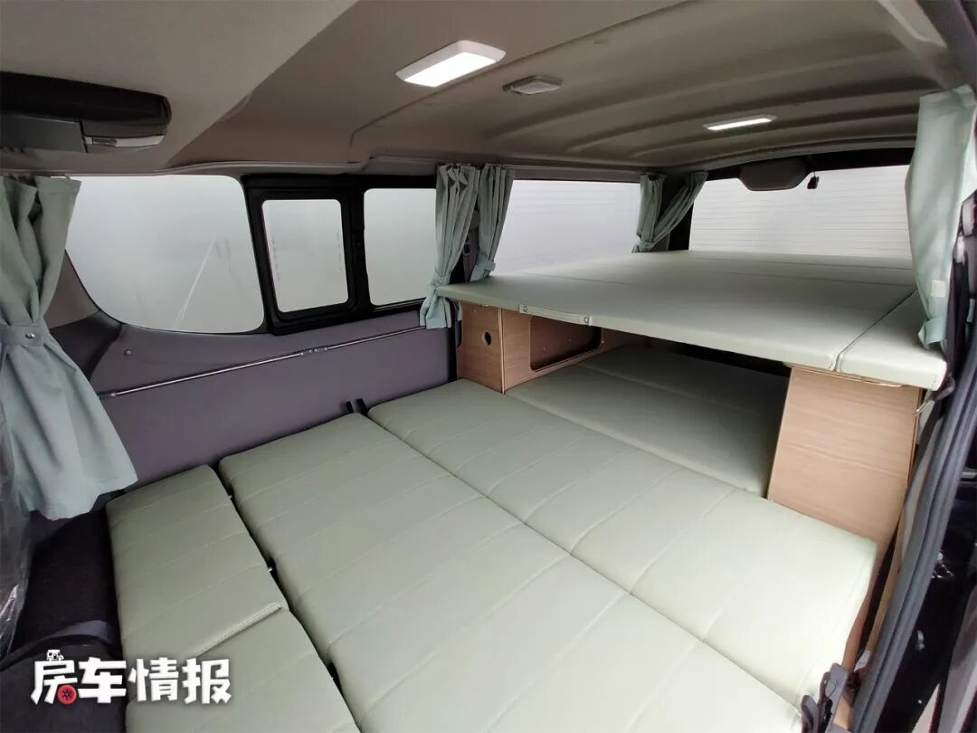 如果有更多人需要休息,那么还可以在车尾的柜子上面再搭起一张床,这样车内就有了一个双层床,上层床距离车顶的垂直高度也很高,躺在上面也不会觉得压抑。