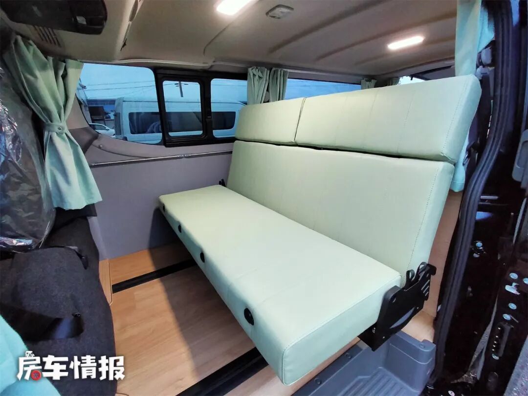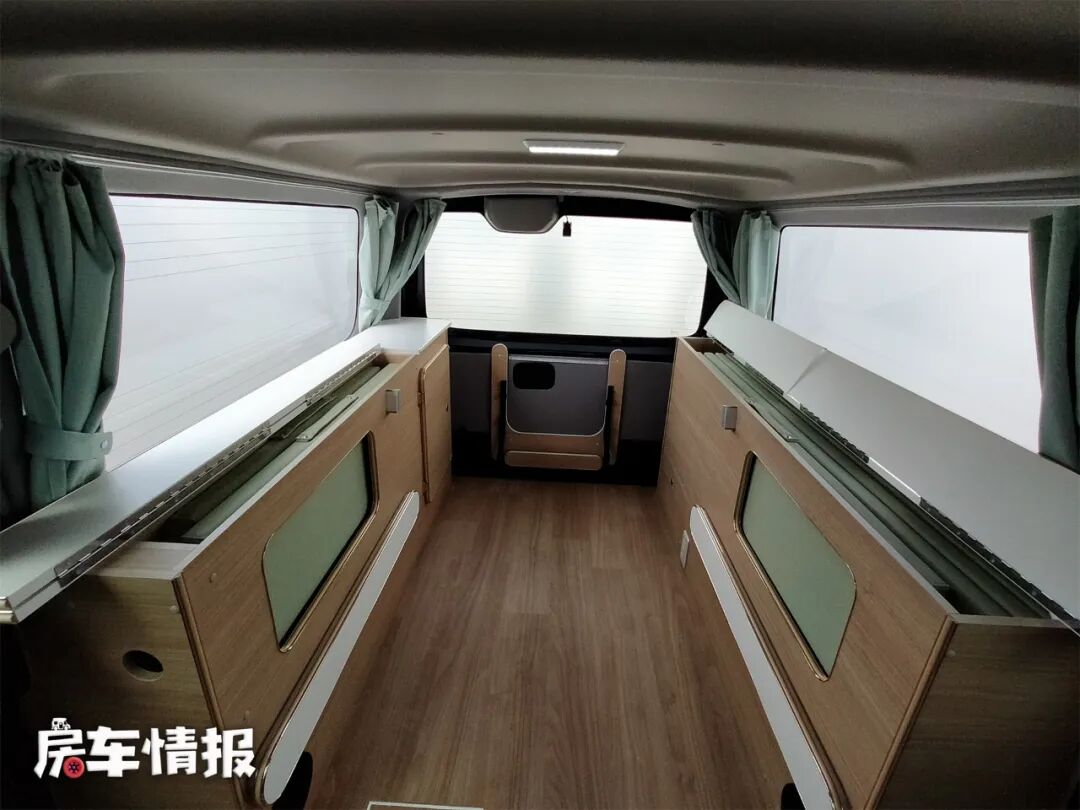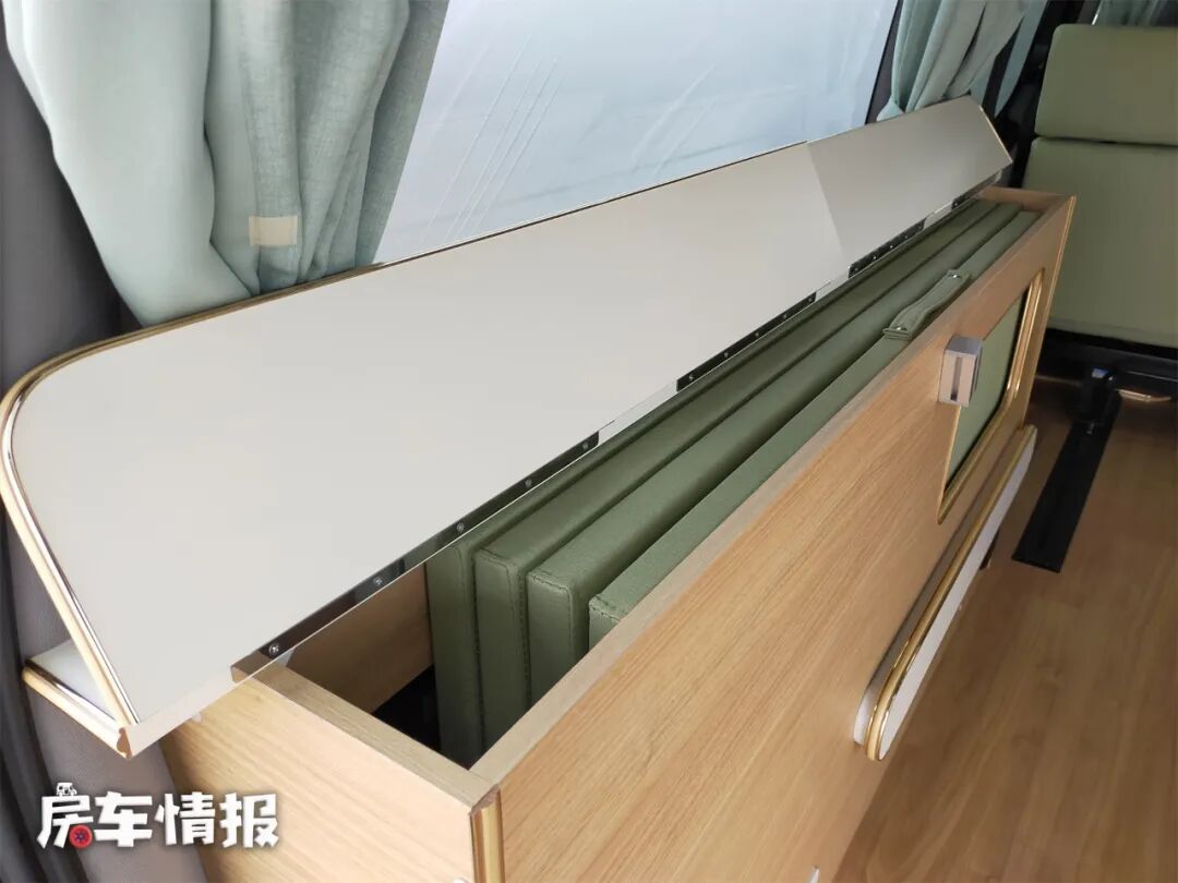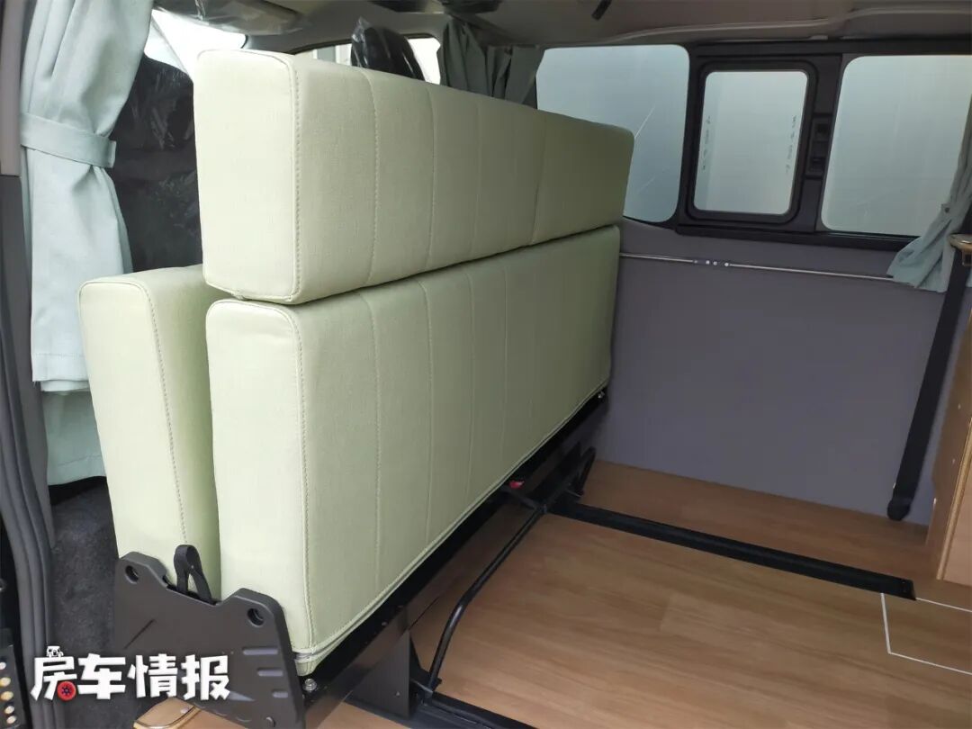 如果有更多人需要休息,那么还可以在车尾的柜子上面再搭起一张床,这样车内就有了一个双层床,上层床距离车顶的垂直高度也很高,躺在上面也不会觉得压抑。