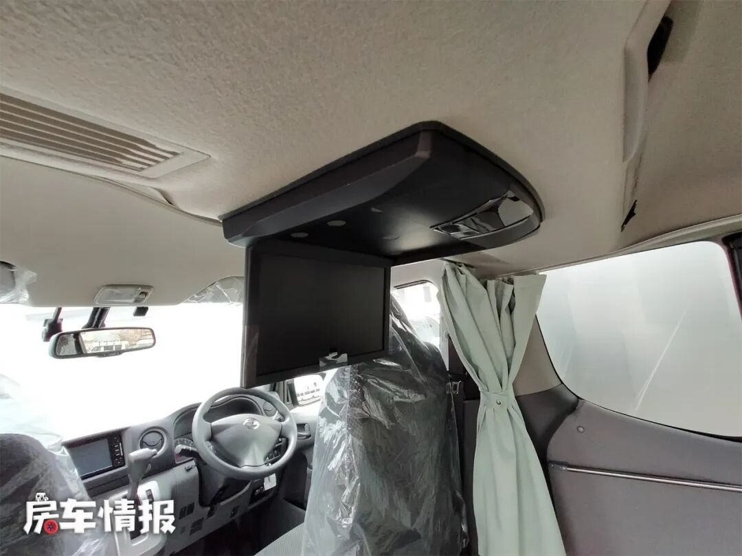 驾驶室后方还有一台翻折电视,打开后在生活区都可以观看,也为车内生活增添了更多的乐趣。