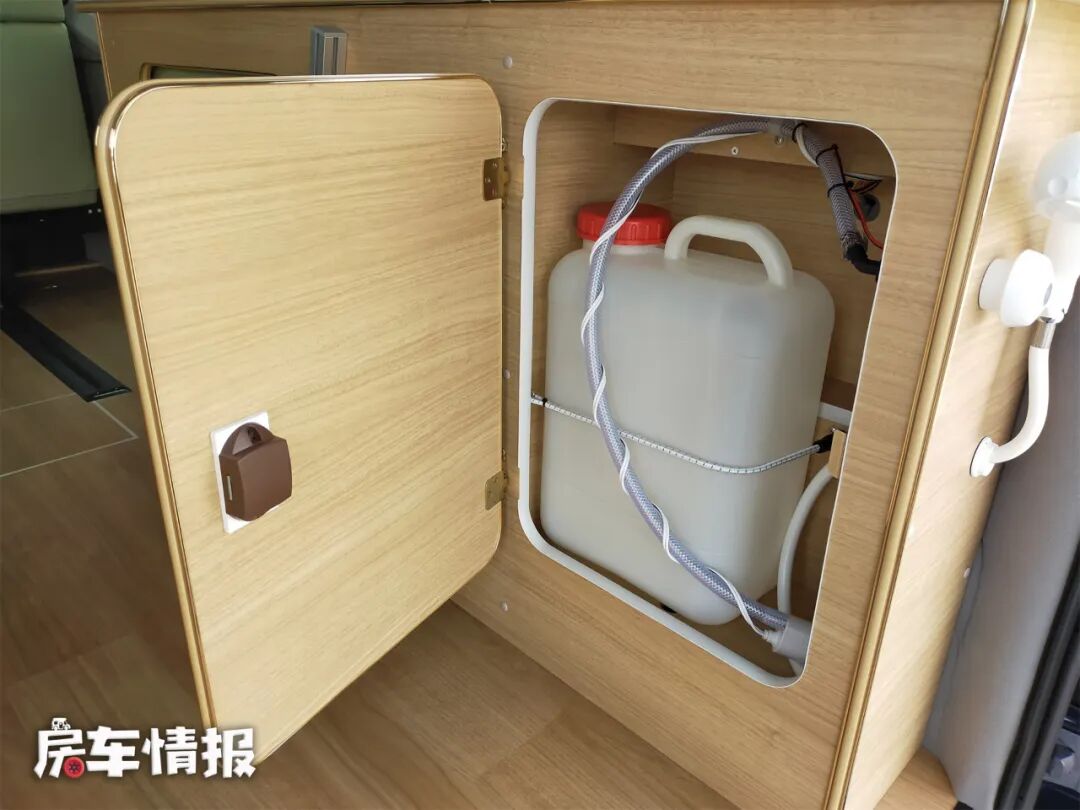 由于右侧储存的是小床垫,所以在柜子尾部还有一个小的空间,柜子里放置了一个16L的清水箱,车尾连接了一个淋浴花洒,柜面上还可以当作厨房的操作台来使用,这样就有了一个小的厨房,只需要携带一个卡炉就可以满足做饭的需求了。