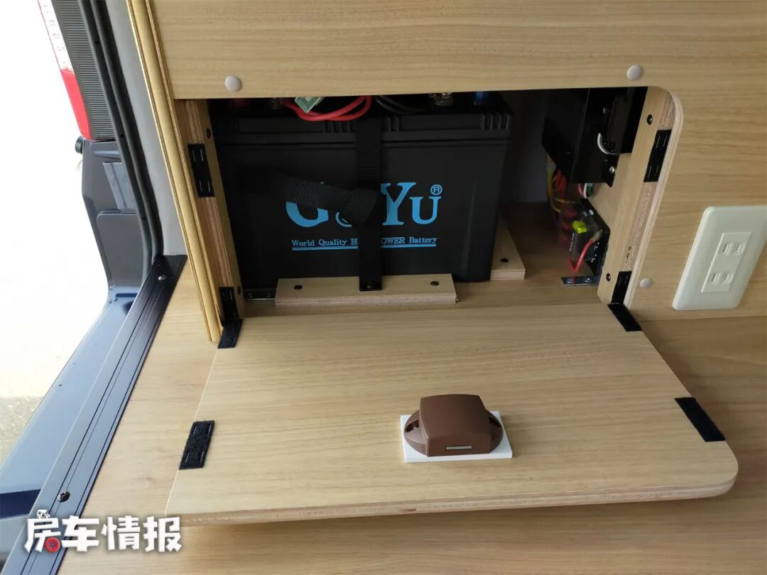 车尾左侧的柜子里装有一台发电机和电源插座,设置在这个位置,在车外外接电源也很方便。