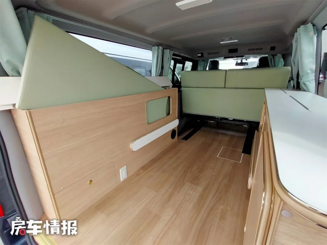 走进生活区,映入眼帘的就是大面积的牛油果绿颜色,沙发、四周的窗帘、床垫都使用了这个颜色,在房车中是没有过的,再加上木质地板,给人一种清新的感觉,让我们来详细的了解一下吧~