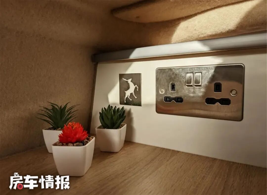 在车尾部的柜子上,还装有USB和12V的电源插座,方便大家在车内使用手机或其他电器。