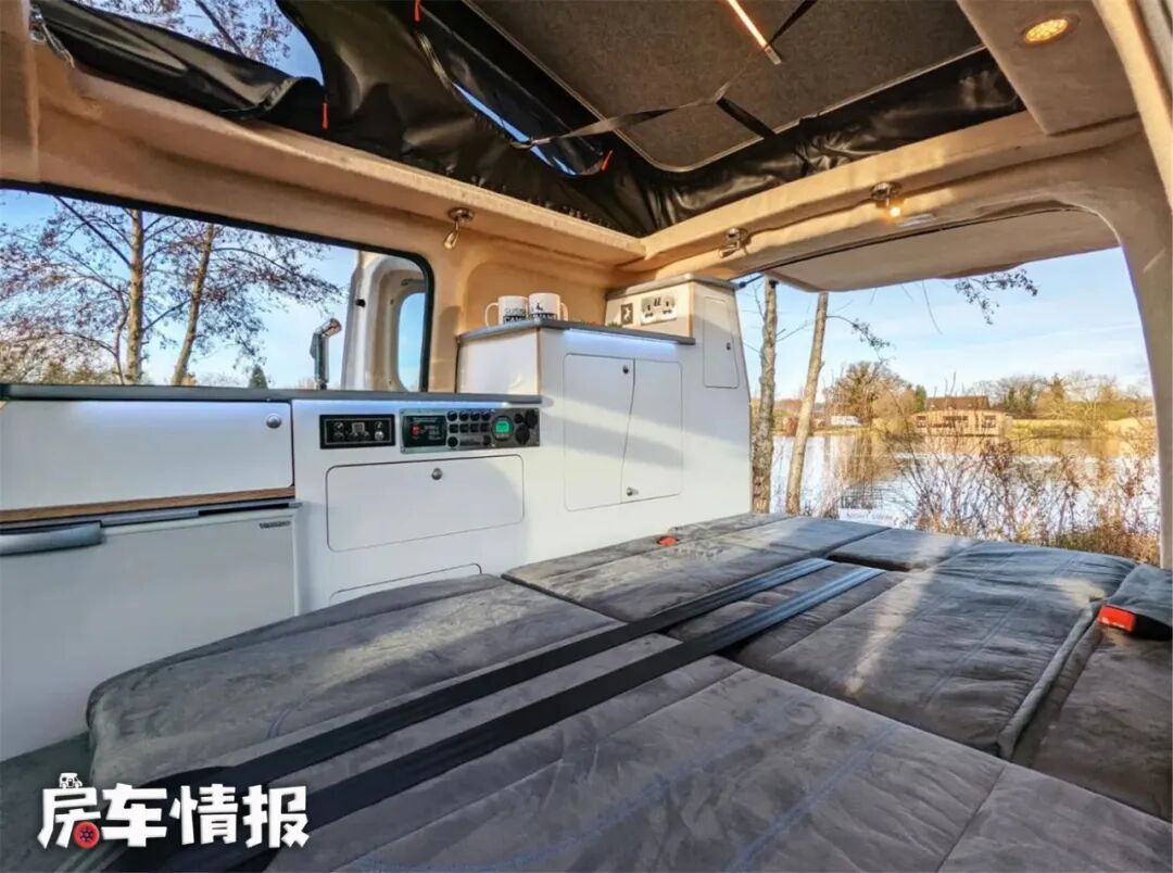 最后便是本车的升顶大床了,这张床更加宽大,睡下两名成年人也不是问题,周围还有透明开口和隐私帘设计,这样既能欣赏车外景色,也能在休息时保证车内隐私。