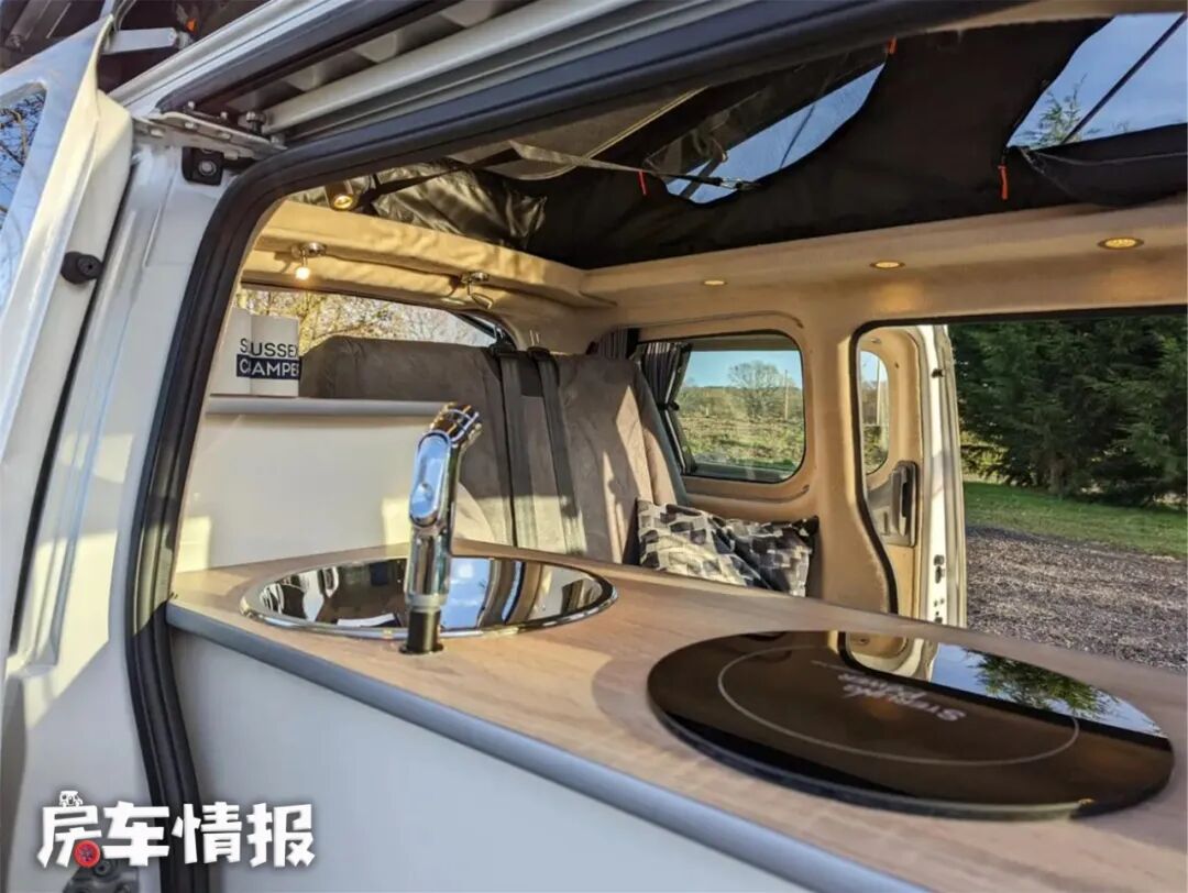 车内生活区的布局比较简单,由会客区、厨房和车顶的升顶区域组成,虽然车内环境比较小,但是也能满足基本的生活所需,可以在户外进行简单的生活。车顶周围装有暖黄色的LED照明设施,让车内更有家的温暖。