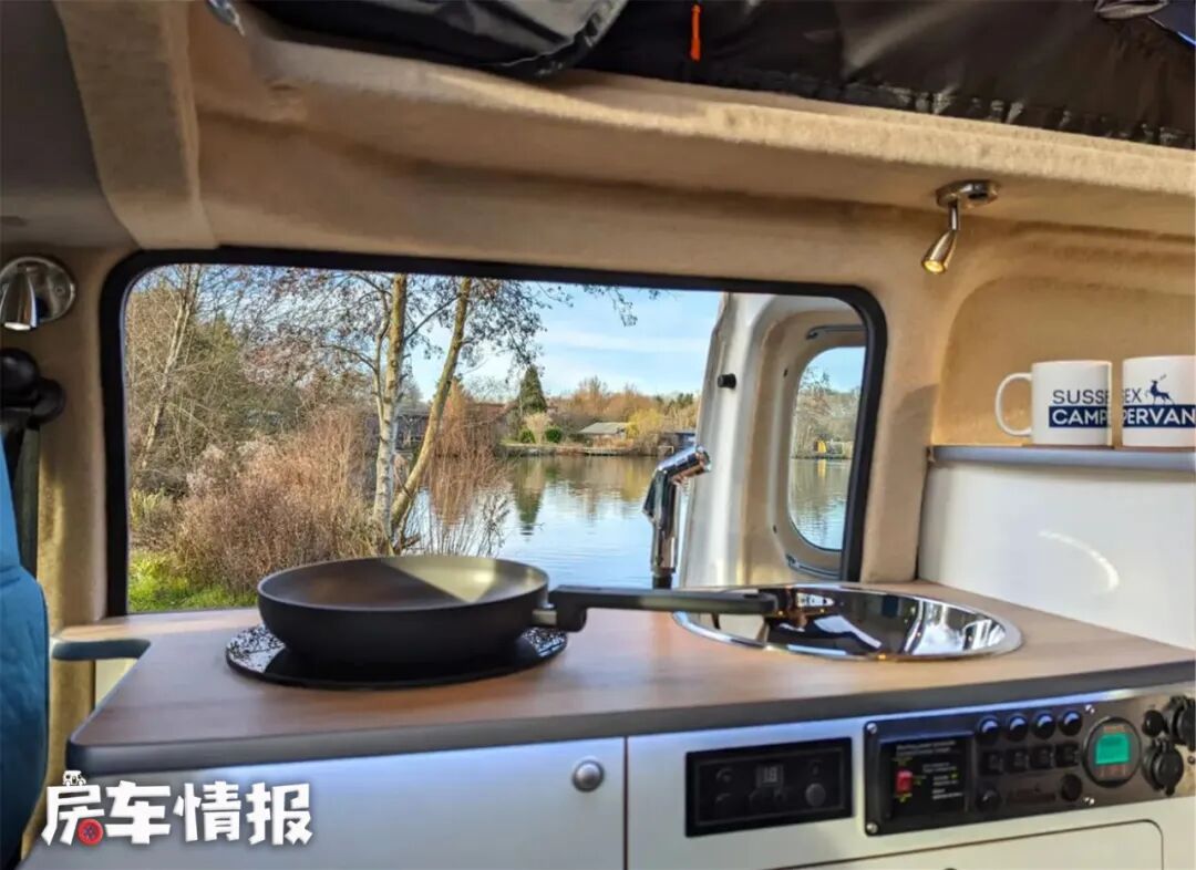 车身右侧是本车的厨房区域,配备了电磁炉、不锈钢水槽、水龙头,橱柜正面还有电器开关,下方还有一台50L的冰箱,可以存放一两天的食物。柜子里还有多个储物空间,可以存放一些出行的物品,更加方便户外生活。