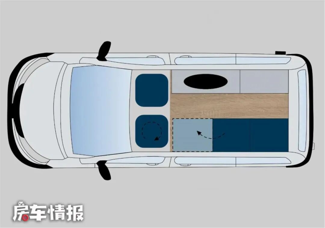 会客区安装的是汽车座椅,带有安装带,所以在行车时也可以乘坐,这样车内就可以乘坐4人了,同时,将副驾驶旋转过来,这里还是个简单的会客区域,大家可以坐在这里休憩,主驾驶由于后方是厨房区的操作台,不能进行旋转操作,如果有需要的话,也可以后续将操作台设计的短一些,就可以形成4人的休息区域了。