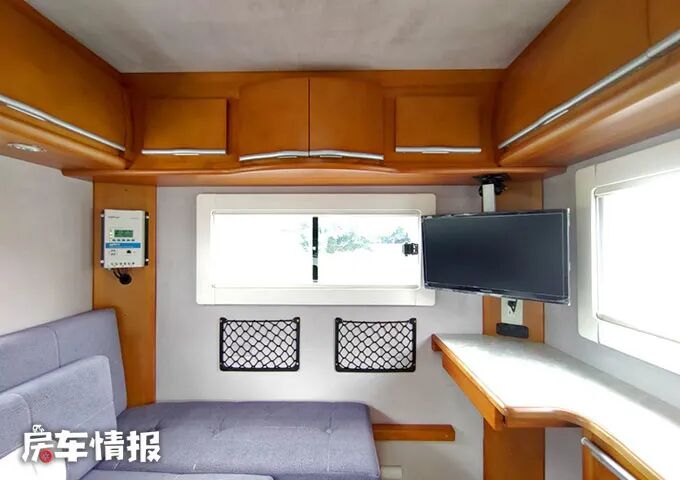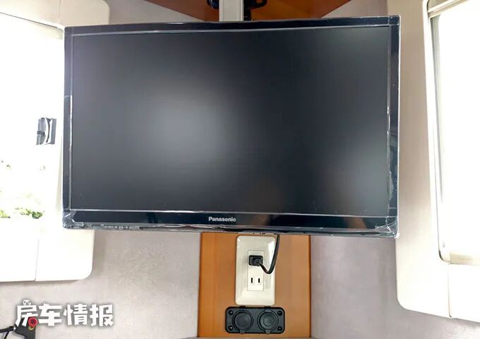 车尾左侧有一台19英寸的松下电视,坐在沙发上就可以随时观看了,为车内增添了更多的欢乐。
