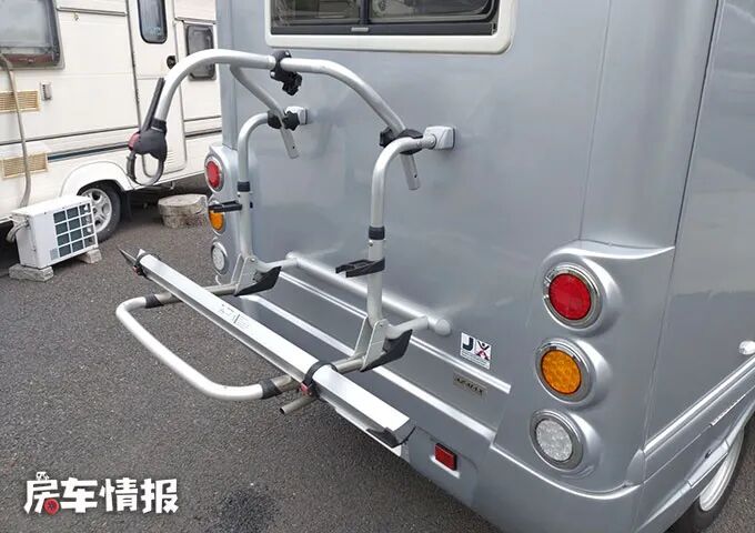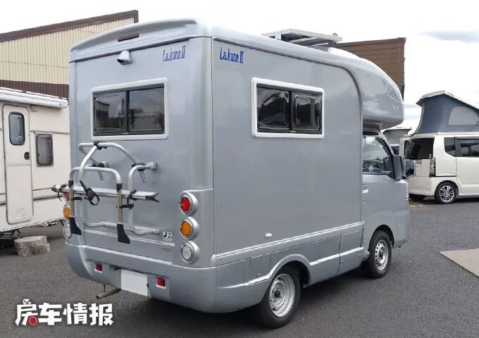 这辆车尺寸为3780*1750*2540mm,虽然从数据上看比较窄,但是车内的设计却很好的解决了这一弊端。车内核载5人,可以满足2名成人和2名儿童的睡眠空间,非常适合父母带着孩子出去玩。本车为银白色车漆,车尾处装有自行车架,为户外生活增添了更多的乐趣,车顶部还装有一块太阳能电池板,方便在户外为车内持续供电。后轮进行了加宽处理,可以更好的承载车厢的重量。