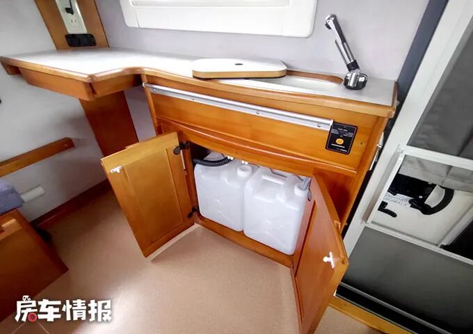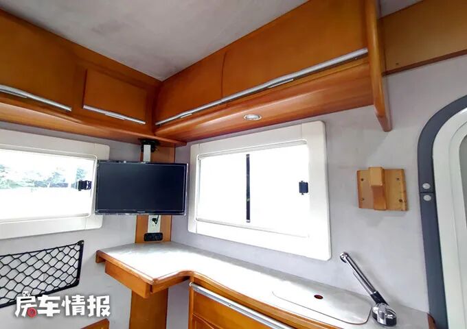 厨房在车身左侧,有一个较长但比较窄的操作台,装有洗菜池和水龙头,带有一个卡炉,也可以携带电磁炉,在左侧电视下方的电源插座处使用。