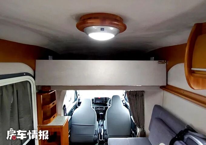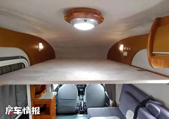 驾驶室上方的额头处,有一张带有部分翻折的双人床,尺寸约为1700*1800mm,里面还有两个床头灯,打开床后,车顶的照明设施也可以提供更多的光源,让这个区域更加明亮。