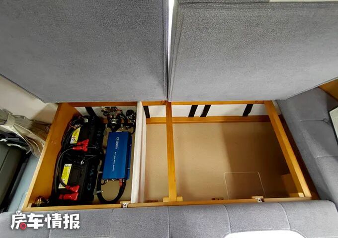 水电方面,这辆车提供了10L清水箱、10L灰水箱以及1500W逆变器、2块100Ah的电池,再加上车顶的太阳能电池板,后续可以将水箱加大,这样就可以放心使用水电了。