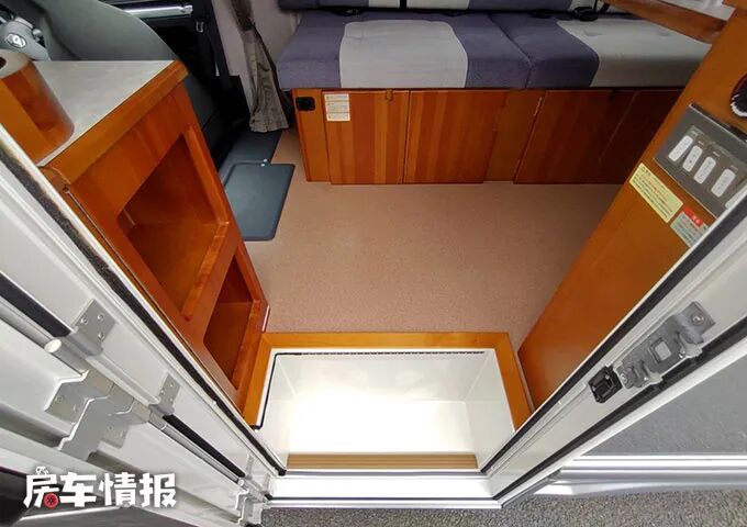 门口处,左侧有一个小柜子,贴心地在旁边设计了开口,可以当作鞋柜来使用。右侧的柜面上有车内灯具和空调的开关以及显示器,方便上车时随手打开。