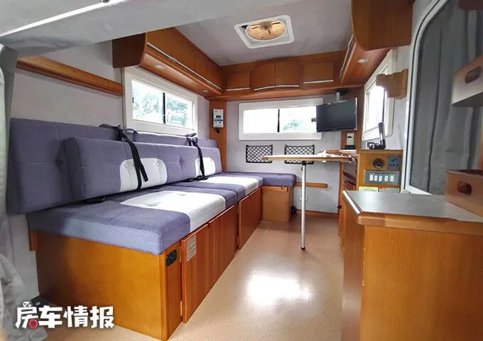 在车身右侧,有一张延伸至车尾处的长沙发,可以坐5人,沙发垫十分厚实,靠背处还有两层垫子,后续还有其他用处。车尾有两个网兜,可以存放一些出行的物品。在车辆中央还有一个可拆卸的餐桌,装卸都很方便。