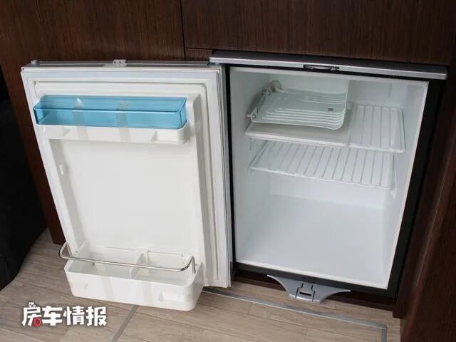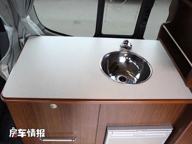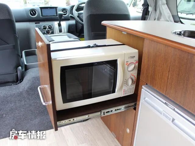 没有了座椅,这里取而代之的是一套厨房用具,提供了美固房车专用冰箱、洗手池、储物柜等,需要做饭的话可以在这里放置一台便携式卡炉。在橱柜内部还隐藏了一台微波炉,使用的时候直接抽出来就可以。