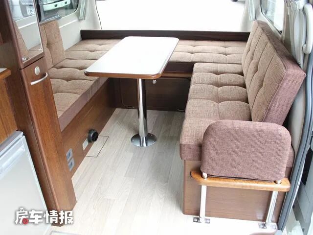 进入车厢内部,可以看到车内的设计相比起常见的同类型房车有着不小的改变,首先位于驾驶室后方区域并没有设置常见的座椅,也因此这里的空间表现非常不错,可以在这里轻松活动。