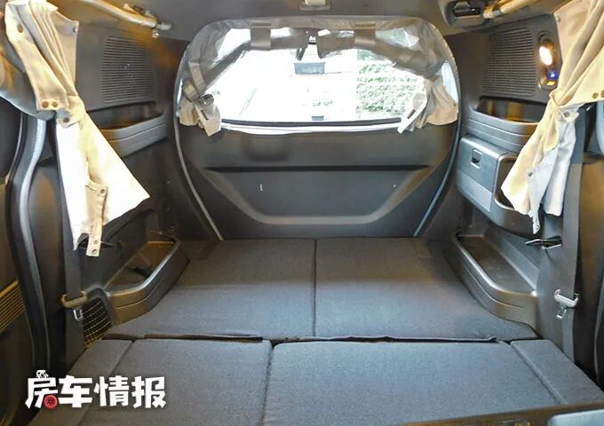 掀开车辆的后备箱,空间还是很大的,可以看到这里放置了几块床垫,尾部也装有隐私帘,全方位保护车内隐私。出行时车尾还可以放置一些行李,5个人的行李这里还是可以放下的。车身两侧还安装了几个储物空间,虽然都比较小,但是也能满足一些小物品的存放了。