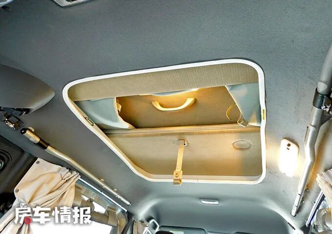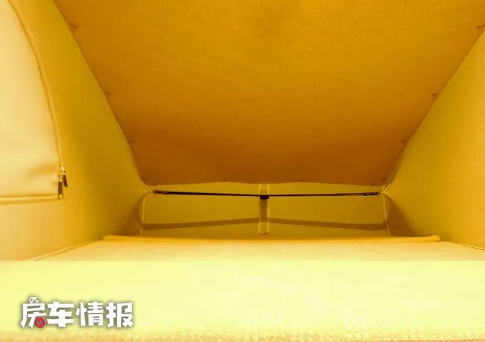 从车内顶部就可以进入到升顶帐篷里,两侧各有一扇带拉链的小窗户,可以为车内通风、增加光照,内部还装有一个暖黄色的照明设施,让车内更加温馨。