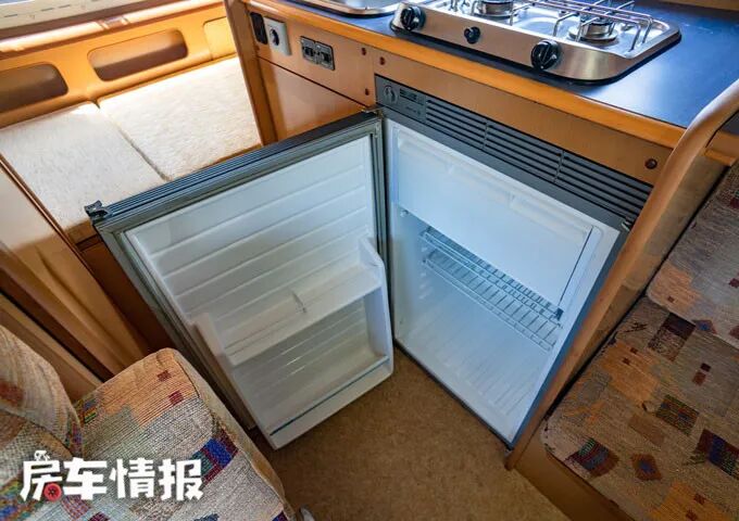 下方的橱柜里还装有一台90L的冰箱,可以存储外出2、3天的蔬菜和肉食。