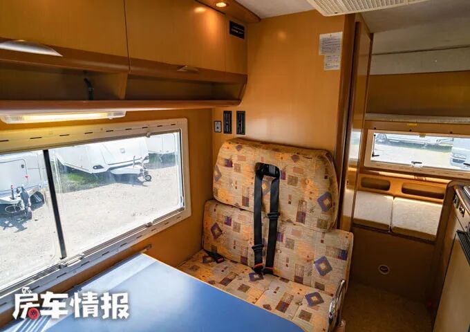 会客区由一张可升降餐桌、一个对坐式沙发和一个单人沙发组成,后排的双人沙发带有安全带,行车时也可以乘坐。顶部装有储物吊柜,可以存放出行的行李。