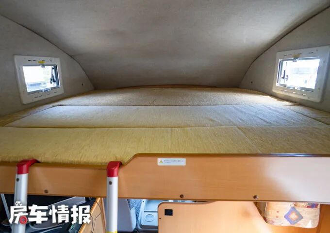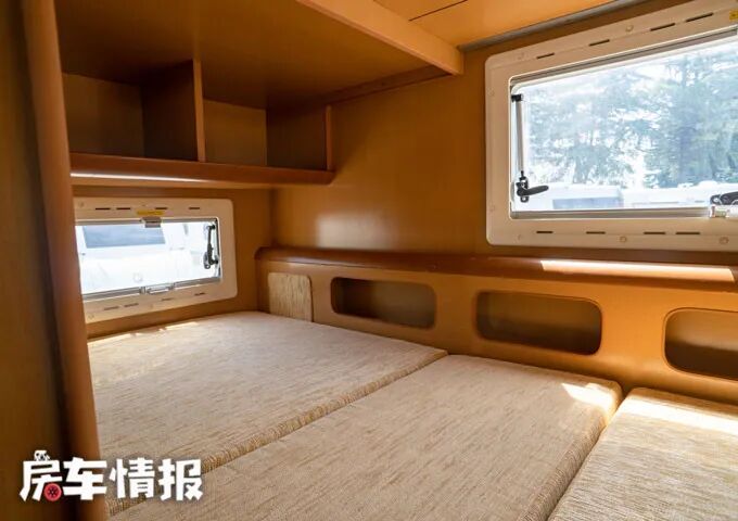 车尾床尺寸约为2000*900mm,上方还有一张同尺寸的单人床,可以睡下两名成年人,车尾的大窗也为这里提供了更多的光照,不会很压抑,旁边还有储物格和床头灯,方便大家的生活。