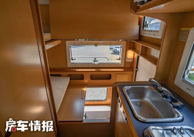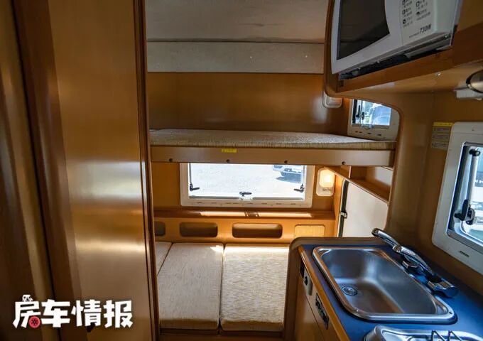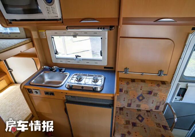 厨房在车身左侧,装有不锈钢洗菜池、两个水龙头和双头的燃气灶,顶部还贴心的装上了抽油烟机,减少油烟对车内设施的污染,吊柜位置还装有一台微波炉,方便大家简单加热饭菜。右侧还有一张可翻折桌板,增加了厨房的操作台面积。