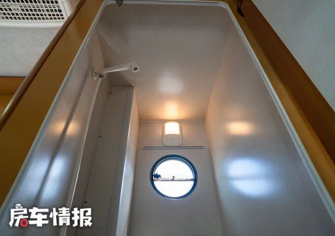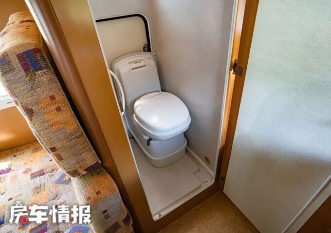 卫生间在车身左侧,装有盒式坐便器和淋浴设施,连接了一台加热器,可以随时使用热水洗浴。