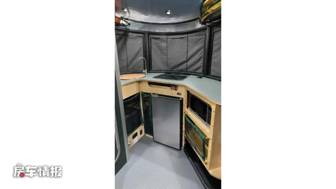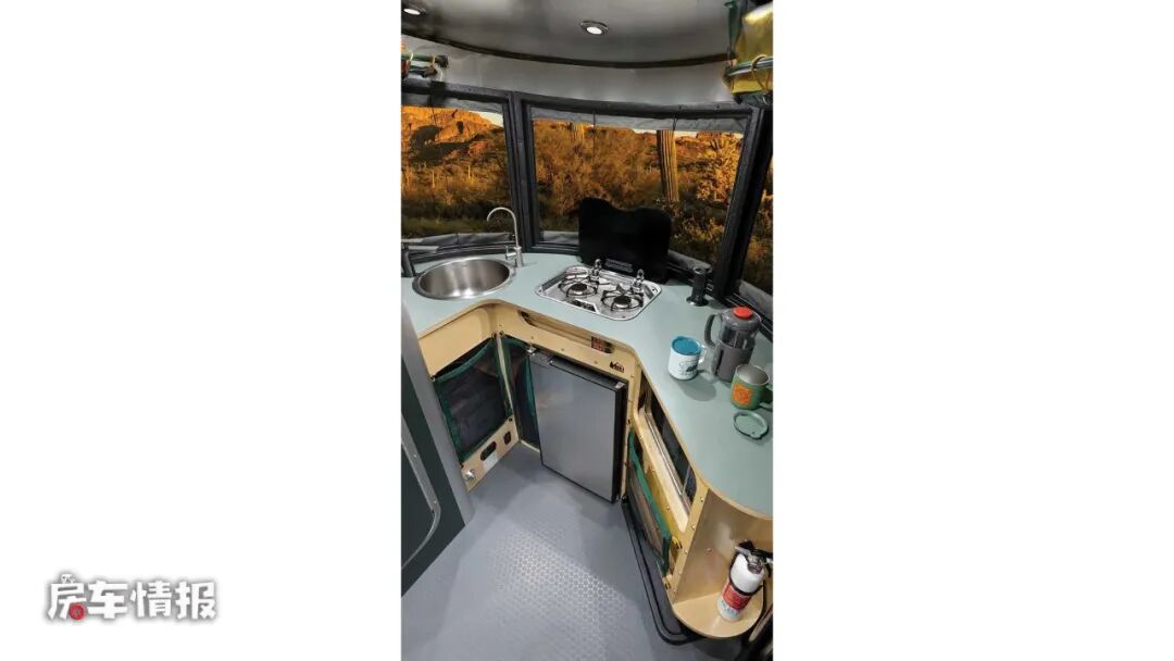 进入车厢内部,整体的设计也非常的新颖和时尚,走到最前方,是整辆车的厨房区域,不过搭配一圈全景窗户,有种开宇宙飞船的感觉。