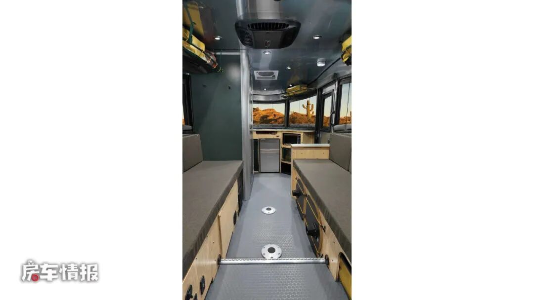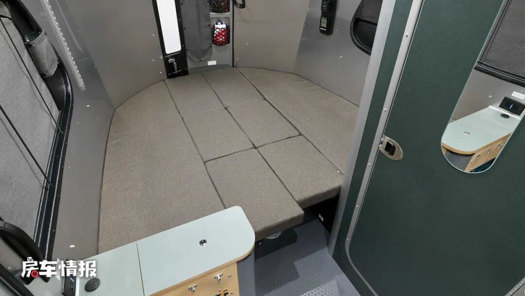 晚上的时候,则可以将两侧沙发互相拼合,变成一张能够容纳两个人使用的小型尾床,顶部还有顶置空调的加持,也能提供一个相对舒适的居住环境。