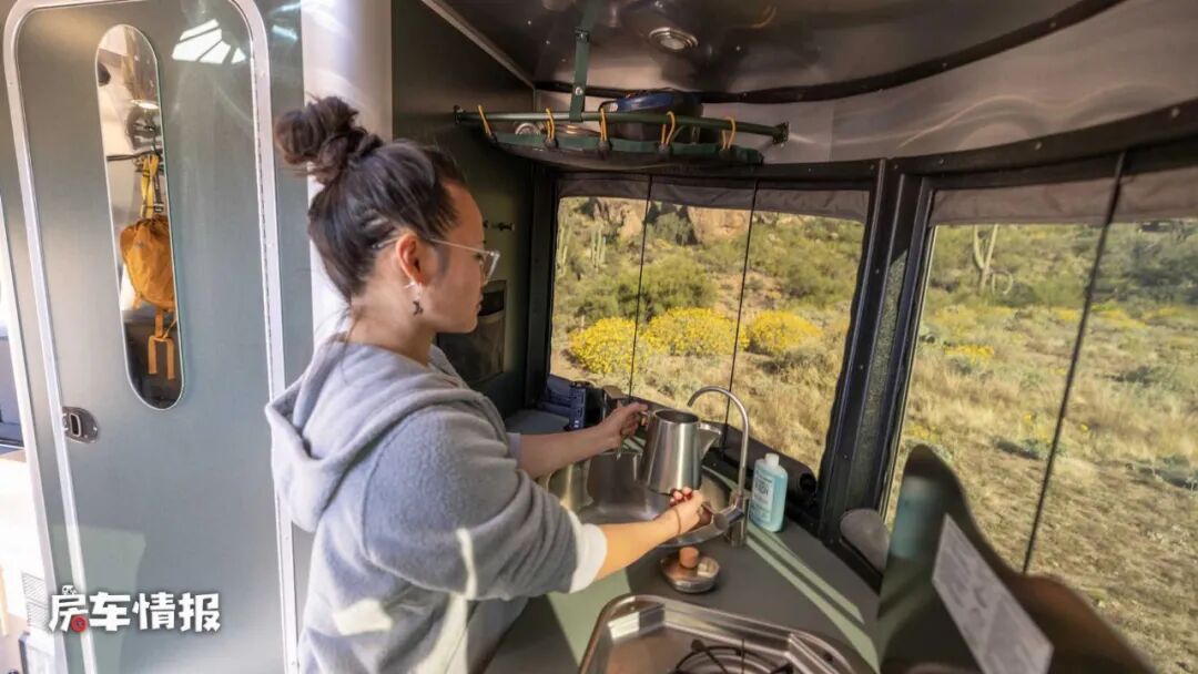 而在水电方面,这款车带有200Ah的电池组,和360W的太阳能电池板,后续也可按自身需求进行升级;水路上全车采用了循环热水器、UV-LED 水净化系统等,能够保证安全实时的用水。