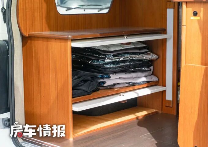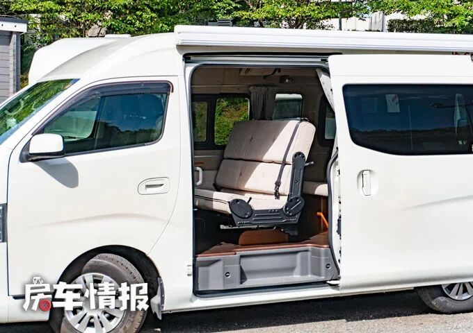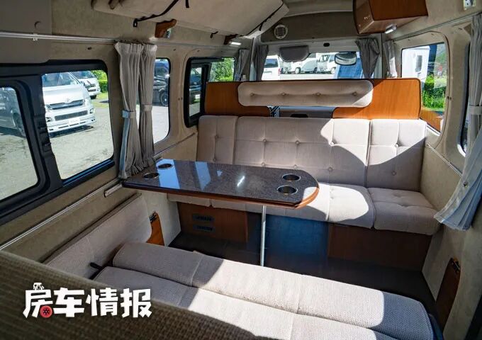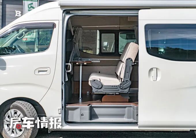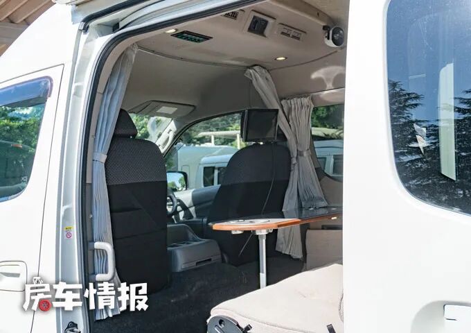 最前方是保留了一排乘客座椅,配有安全带,日常可以乘坐,座椅前方还提供了一张小型的餐桌,可以进行简单的就餐或者是工作,在副驾驶座椅后方还配置了一台小型的电视机,能看看简单的电视节目,满足基础的娱乐需求。