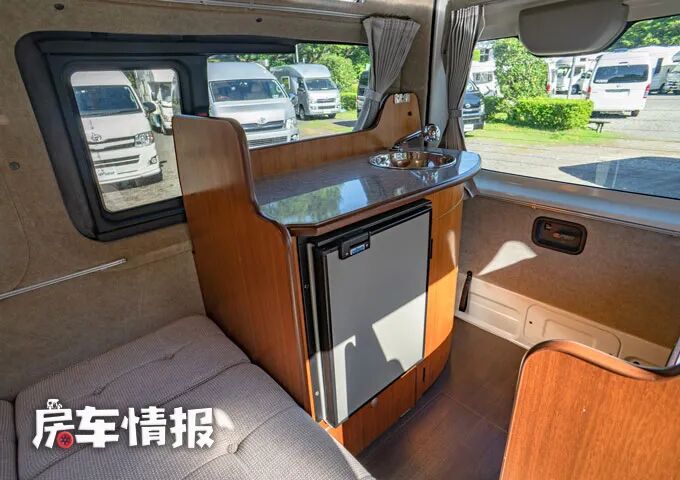 车厢最尾部是整辆车的厨房区域,一侧是带有基础的操作台,台面上提供了不锈钢的水槽,下方还有一台49L单开门带有冷冻盒的车载冰箱,旁边的空置区域可以放置卡式炉或者微波炉,以满足最基本的烹饪需求。