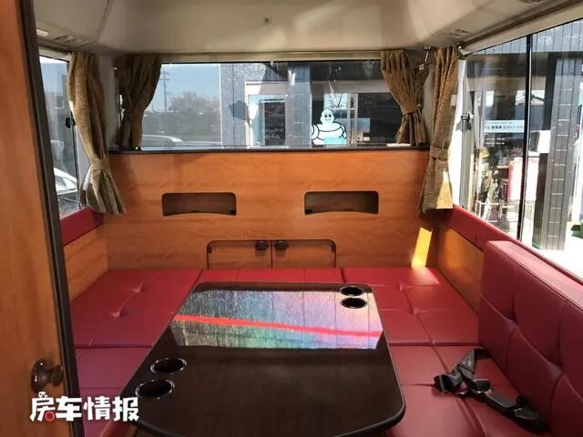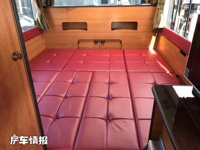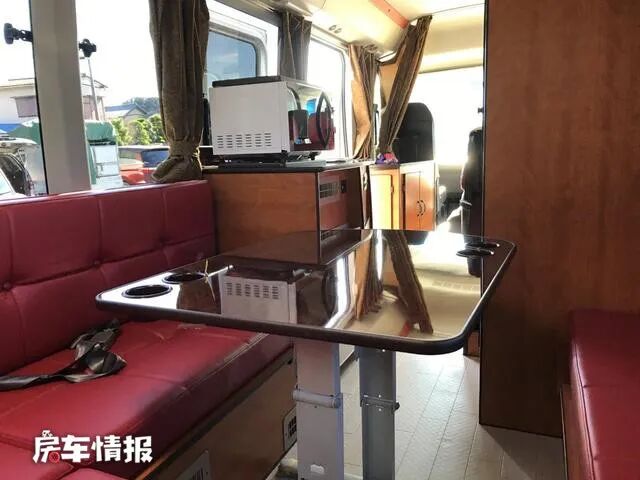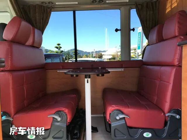 车厢内部的整体布局设计相对来说就要居家不少,和国内能见到的偏豪华商务的柯斯达房车相比,明显海外消费者更喜欢这种居家的感觉,原木色的家具搭配酒红色的皮质座椅包裹,给人的感觉更像是一个简配版的小旅馆。