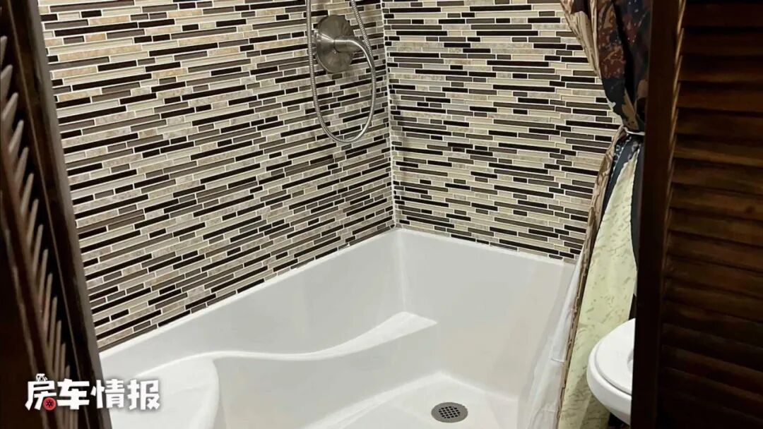 在通往后方主卧的过道一侧,是全车的独立卫浴室,而且这个内部除了提供了基础的马桶,还配有一个小型的浴缸,可以说在车内就能享受泡澡的休闲时光,想想就很惬意。