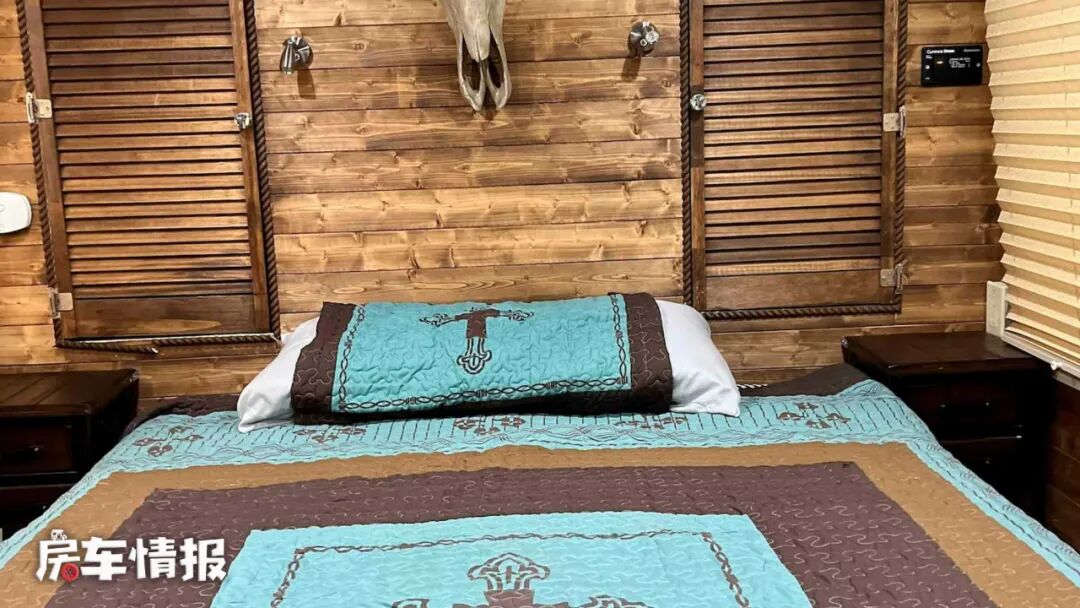 最后就是位于车厢最尾部的超大卧室,内部提供了一张能够容纳2-3人的大床,两侧还有基础的床头柜,而且整个卧室内部的设计特别的原始风,四周都采用了木质板材的包裹,感觉就像森林中的城堡一样。
