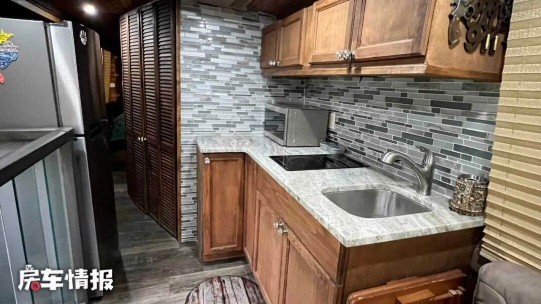 与乘客们相对的则是全车的厨房区域了,采用了L型厨房操作台的设计,台面上提供了基础的微波炉、电磁炉、不锈钢水槽等,可以满足日常的需求,另外上下方还带有多个储物的空间,以满足整体的储物需求,而全车的冰箱,则位于厨房操作台的对面,对于日常的使用也提供了便利性。