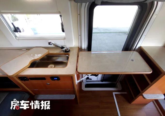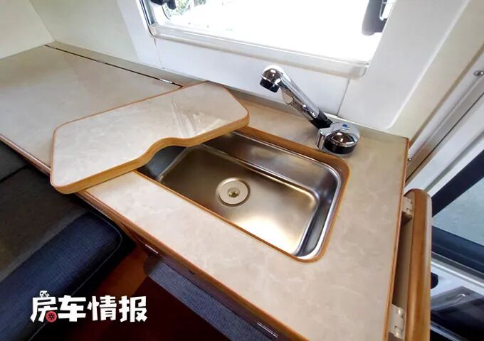 后方则是全车的厨房操作台,整体的空间还是不错的,侧面还加入了超大尺寸的拓展桌板,用来满足日常备菜的需求,上方提供了基础的盖板水槽,左侧则可以用来放置一台便携式的电磁炉或者卡式炉,这样一些简单的烹饪需求也能够满足。